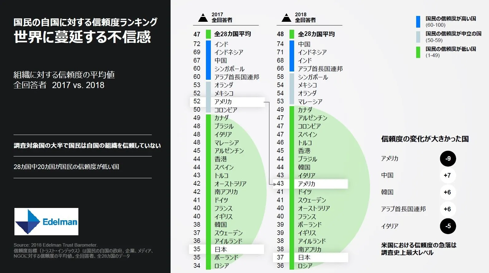 世界的に信頼は極めて二極化しています。日本では、西欧の民主主義国同様に、メディアや情報源への信頼の喪失が、共通の事実や客観的真実のない世界を生み出し、たとえ世界経済が回復しても信頼度を下げています。一方、発展途上国では信頼度が高まり、従来の地政学的な想定が揺らいでいます。米国と中国では信頼は正反対の方向へ向かっており、本年度の調査結果で、中国では信頼度が極端にポジティブな方向へ変化した一方、米国では極端にネガティブな方向へと変化しています。日本は、緊密な同盟国である米国と近隣国である中国の双方とユニークな関係を持ち、両国が重要な貿易相手となっています。