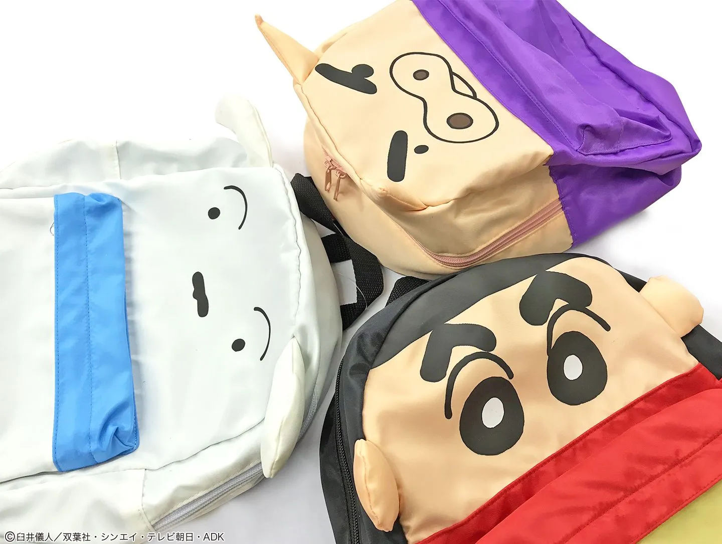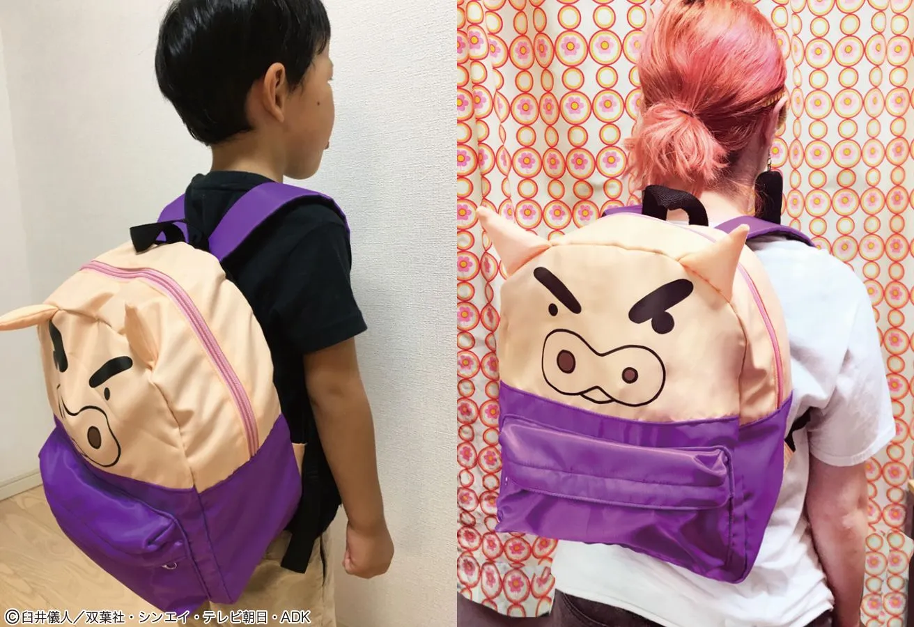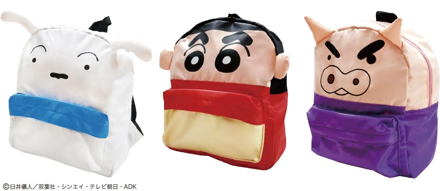 しんちゃん・シロ・ぶりぶりざえもんの顔をそのままリュックにしたインパクトのあるデザイン。立体的な耳の部分がリュックからぴょこんと飛び出しているので、とっても可愛くて目立ち度満点のアイテムです。