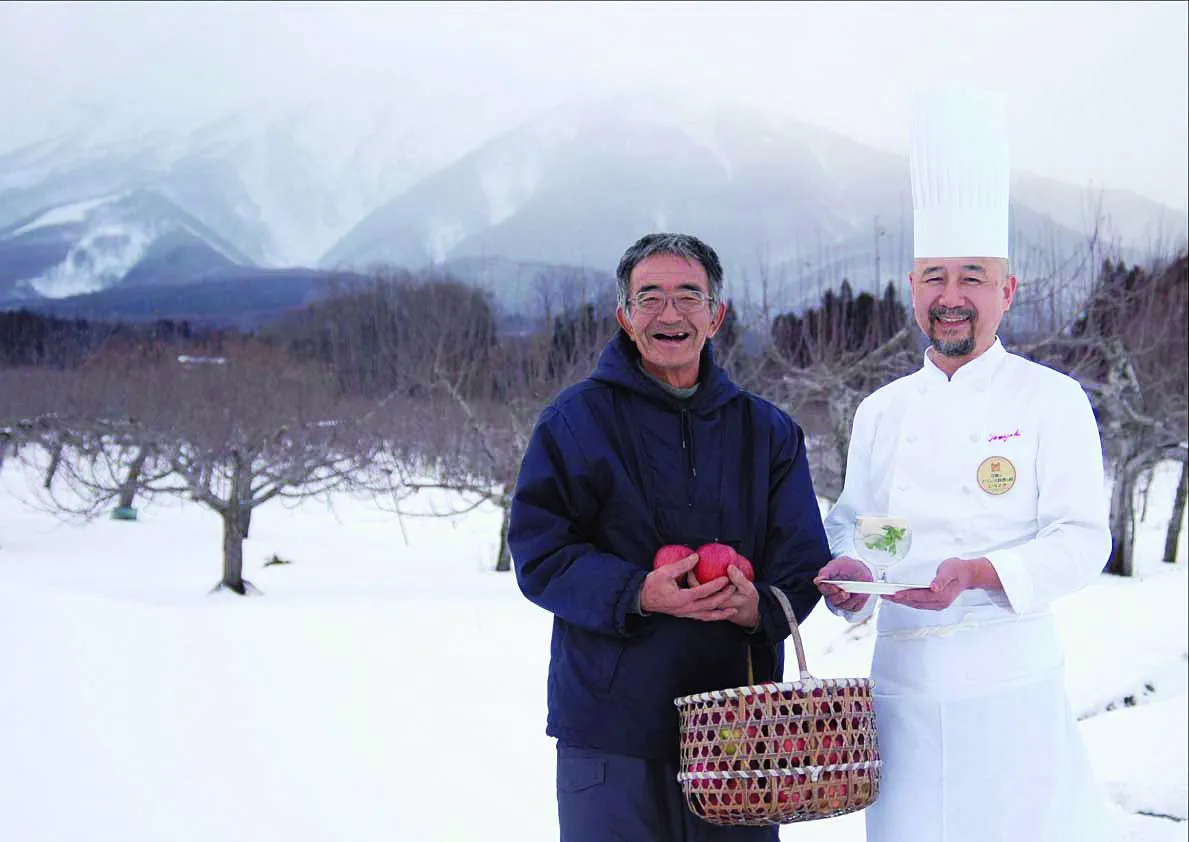 (左から)木村秋則さん、山崎隆シェフ