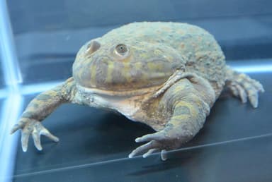 体長11cm~12cmの扁平な体をもつカエルです。体色は緑色がかかった灰色で、オレンジ色の斑点と白っぽい腹部をもちます。体の大きさの割には非常に手足が短いのが特徴。まん丸な目玉やかわいらしい見た目からペットとしても人気があります。