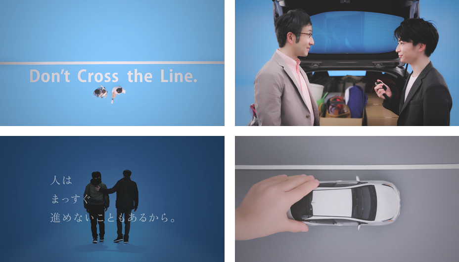 主人公が、赤ちゃんから高校生、大学生と成長する過程の中で、親とすれ違っていく様子を断片的に追ったストーリーが、画面の真ん中にある1本の白いラインを中心に展開されていきます。「人はまっすぐ進めないこともあるから」。我が子が「白いライン」を越えて危険な世界に足を踏み入れないように見守る父親の姿を通して、「車線はみ出しアラート(※1)」などの機能により「人(運転手)を守るために見つめる」というトヨタの想いを表現しています。
