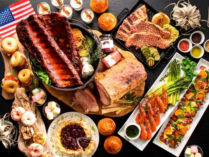 ベーコンと色々野菜のガンボスープ、クルミ風味の豚肉ロースト ボストン風ベイクドビーンズ添え、アメリカンスクエアピザ、海老と野菜のガーリック炒め ピカーダと共に、ジャンバラヤ、バッファローチキンウィング