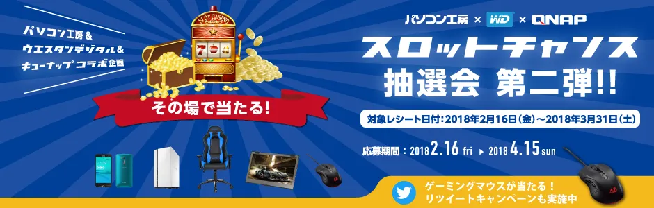 パソコン工房・グッドウィルを運営する株式会社ユニットコム(代表取締役:端田 泰三、本社:大阪市浪速区)は、パソコン工房Webサイトにて、パソコン工房&ウエスタンデジタル&QNAPコラボ企画『スロットチャンス抽選会 第二弾』を開催中です。