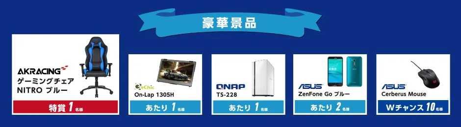 「その場で当たるスロットチャンス抽選会第二弾」を開催します。スロットチャンスゲームの特賞は話題のゲーミングチェア「AKRacing NITRO(ブルー)」をプレゼント!その他、話題のガジェット「On-Lap」「QNAP」「ZenFone」など豪華商品をご用意しました。