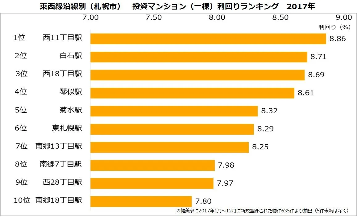 不動産投資と収益物件の情報サイト「健美家(けんびや)」を運営する健美家株式会社(本社:東京都港区、代表取締役社長:倉内敬一)では、同サイトに登録された新規物件を集計し、「東西線(札幌市)沿線駅別一棟マンション投資利回りの平均」の調査結果をまとめましたのでお知らせいたします。