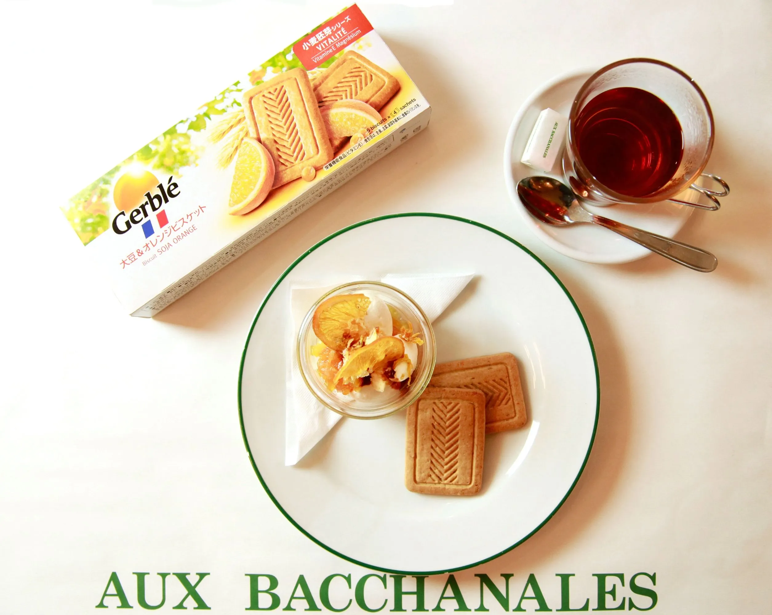 「ジェルブレ 大豆&オレンジビスケット」に、オレンジの風味付けをしたホイップバターとオレンジキャラメルソース、そしてオレンジコンフィを合わせました。オレンジの香り高いバター・ソースをビスケットでディップしてお召し上がりください。