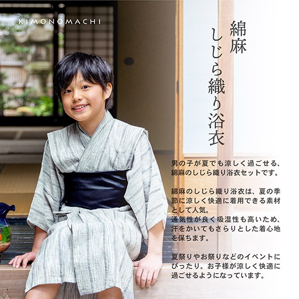 きもの町の男の子浴衣は、大人の男性浴衣や甚平と同じ綿麻しじら織りの生地が使用されています。