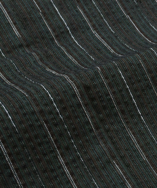 黒みの深緑色の地に茶色や細いベージュの入った乱れ縞。黒っぽい地の色ですが光によって見え方が変わります。