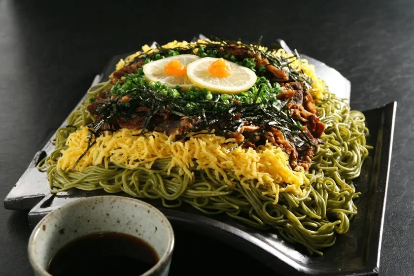 瓦そばは、山口県下関市豊浦町で親しまれている郷土料理です。熱く熱した瓦の上に茶そばと甘辛く煮た牛肉、錦糸卵、ねぎ、刻み海苔などをのせて、温かいめんつゆで食べるつけ麺タイプの焼そばです。