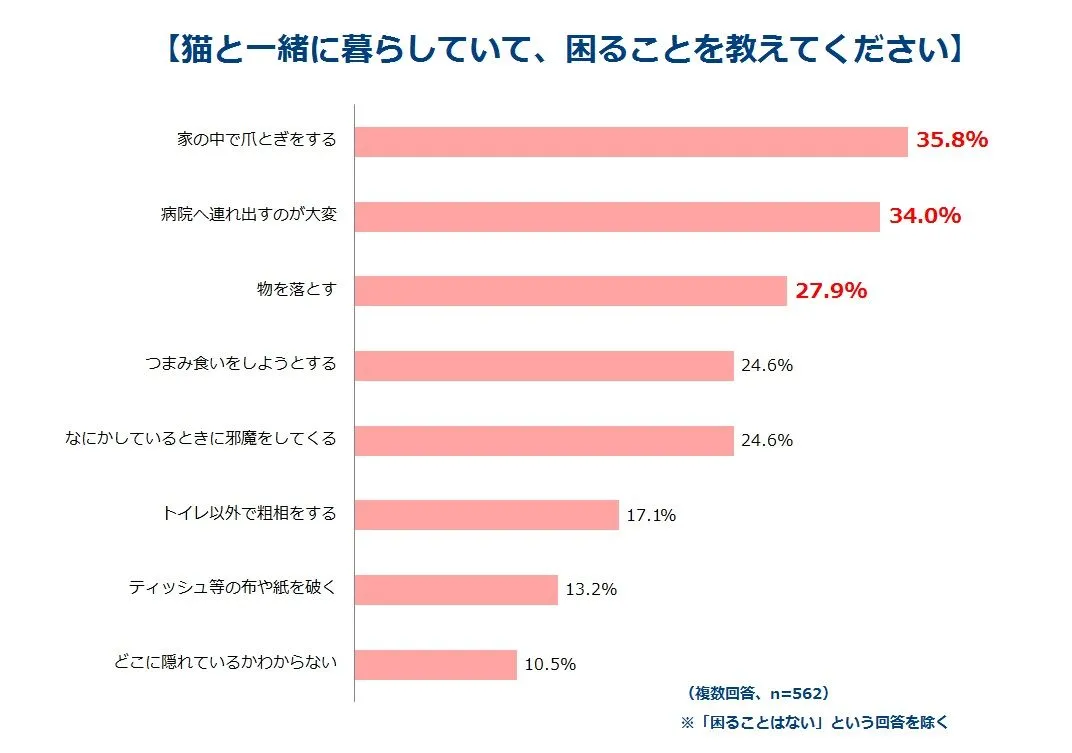 ・猫と一緒に暮らしていて困ること、「家の中での爪とぎ」が第1位の35.8%