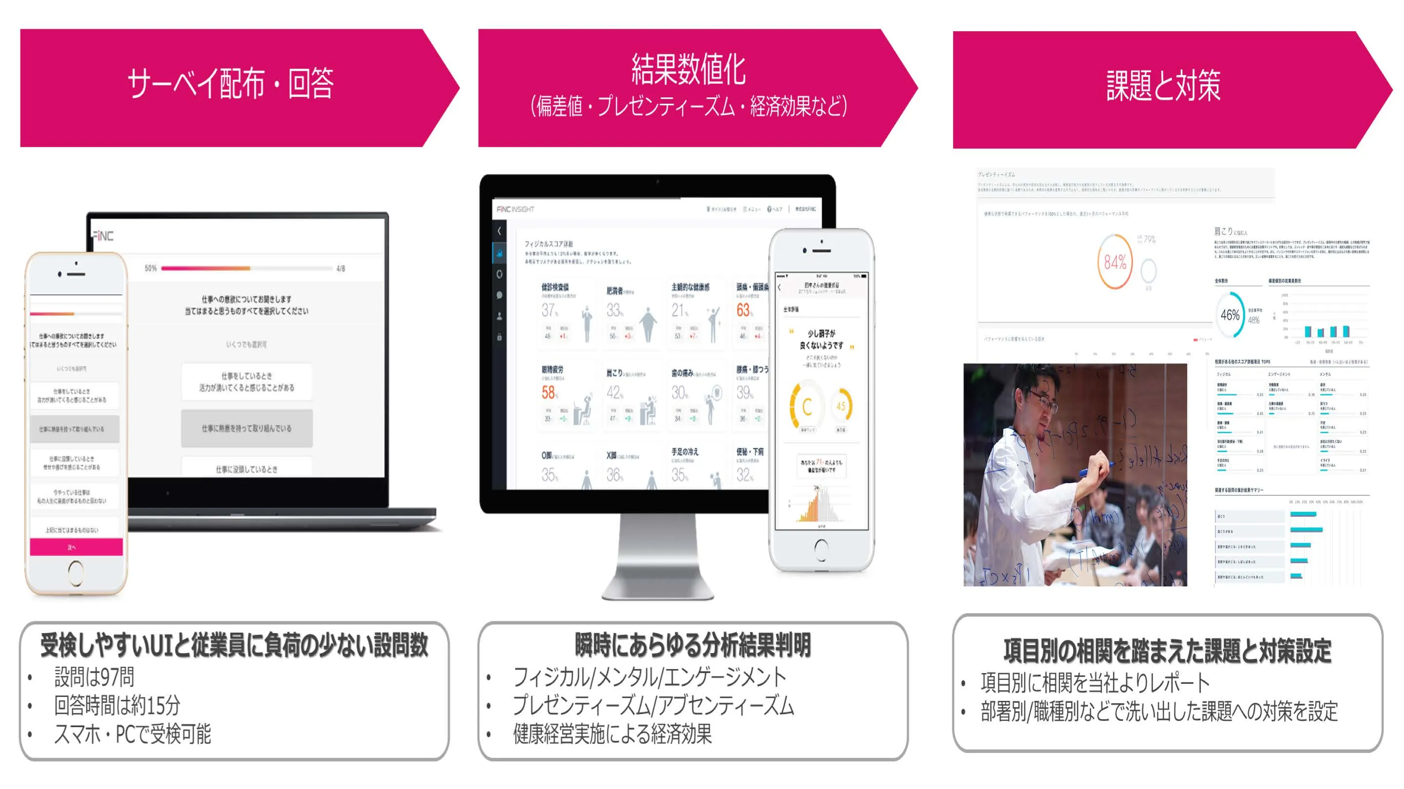 FiNCウェルネスサーベイで、企業の健康課題を数値化・見える化し、対応すべき課題や項目の優先順位を明確にします。