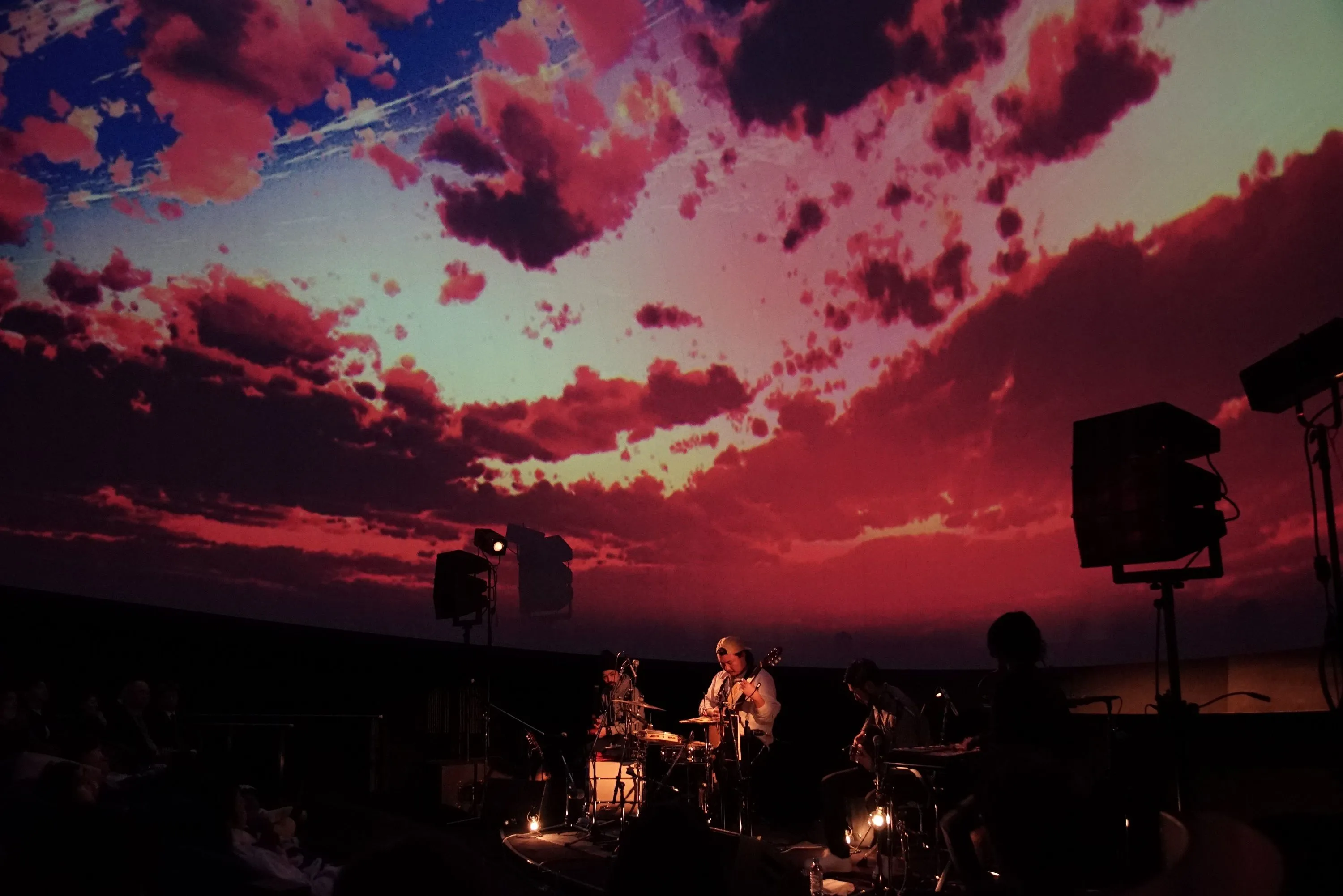 うっとりしたところに、ドラム宮原の囁き声。「おはようございます」とまるでドッキリ番組のようなMCにキーボードの芹澤がツッコミを入れ、会場から笑いが起こる。しばし感動を分かちあったあと、ドーム内は再び星でいっぱいに。往年のスタンダードナンバーを引用したインタールドでは、星が床面にも映し出され、まるでミラーボールのような演出。本当に宇宙空間を自分が漂っているようにすら感じることができた。