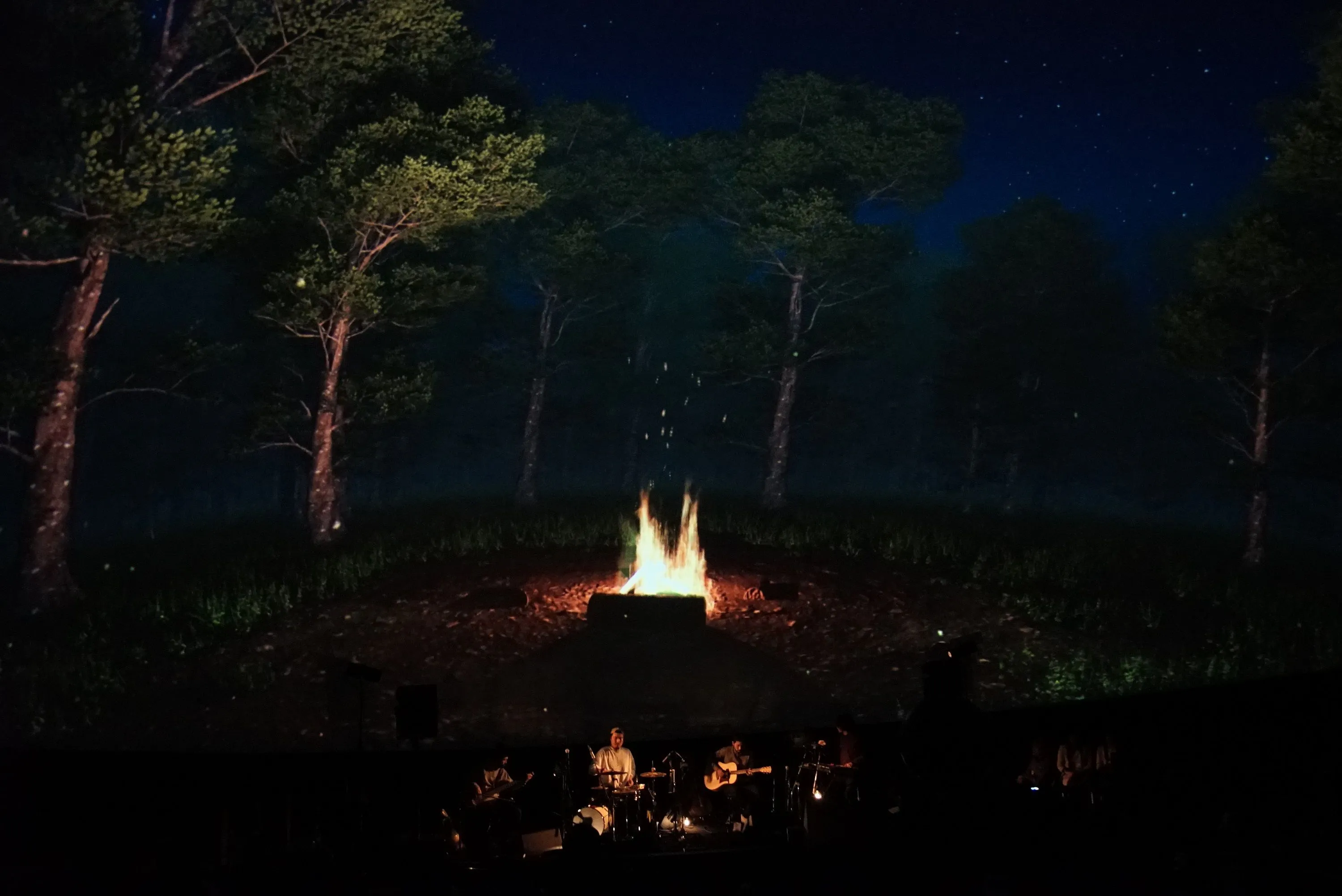 6曲目「LINE」もS.O.Aの代表曲。まさに野外フェスの夜、という雰囲気の穏やかな曲調に合わせて、ドームには夜の森の情景が広がっていく。ゆらめくキャンプファイヤーの炎、それを囲む木々、そして頭上には星々が、音楽に合わせるようにゆっくりと日周する。プラネタリウムでしか味わえない、極上の時間が流れていく。