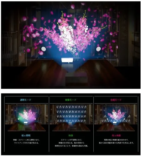 コントロールが可能な透過型スクリーンを桜の前後に設置し、映像と桜のコラボレーションを展開します。COSMIC LABが演出する映像の世界を、特殊なスクリーンが組み合わさったオリジナルシステムを使用して展開します。