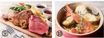 ローストビーフ・ポークソテー・チキンの盛り合わせが一度に愉しめる「ヴィアンド・ヴァリエ」(写真(9))や、たっぷりの魚介類と野菜を煮込んだ「魚介のブイヤベース」(写真(10))など、人気メニューも引き続きご用意。