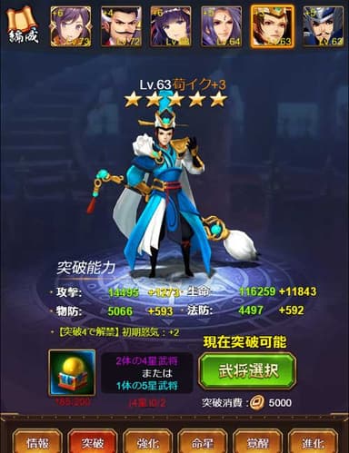 銅貨を使い、装備を強化することができます。強化ボタンを押すことで自動的に強化が行われ、攻撃力や防御力のステータスが増加します。他にも、突破石を使い、武将の限界突破を行うと、武将のステータスが大幅に増加します。このように、武将の強化にはそれぞれアイテムが必要です。アイテムがドロップする戦役は、時間回復で挑戦可能になりますので、定期的に戦役を行いましょう。