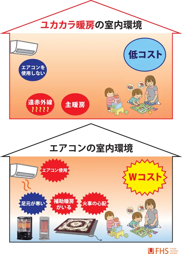 エアコンでは天井付近の空気ばかりが暖まり、足元が冷えるためストーブや電気カーペットなどの補助暖房が必要となって二重に経費がかかり、火事の心配もしなくてはなりません。