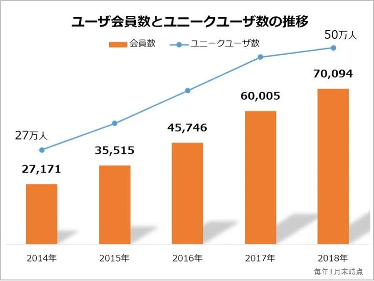 毎年増え続けているユーザ会員数は2015年以降、年間1万人ペースで新規登録があり、2018年1月に7万人を突破しました。それに伴い、ユニークユーザ数も2014年からおよそ2倍の50万2,369人に増加しました。