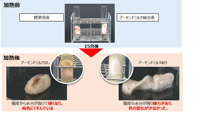 アーモンドミルク抽出液は色の変化が少なく、鶏皮は、水分が残り弾力のある状態で色の変化は見られませんでした。
