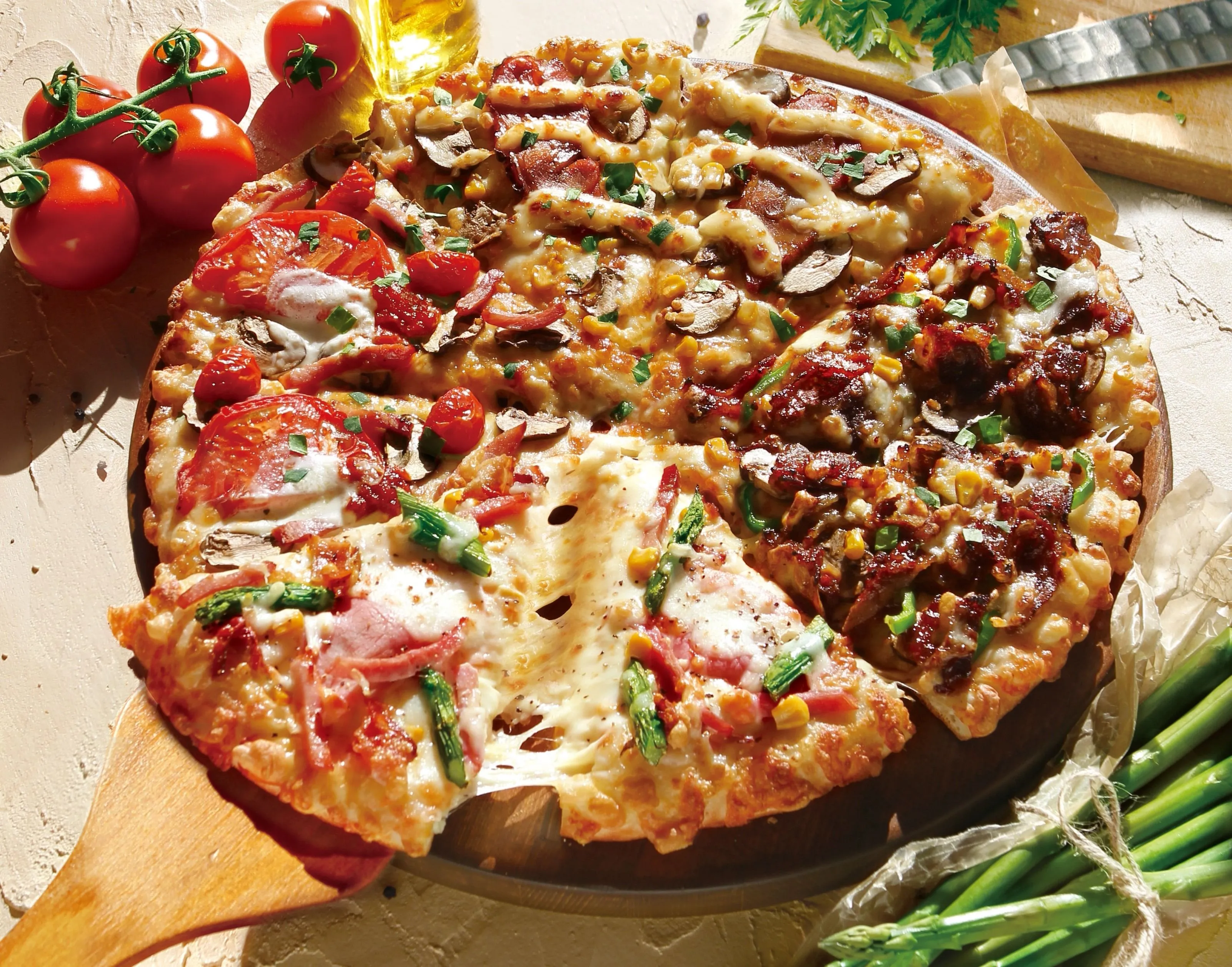 食べ応えにこだわったアスパラは店内にて包丁でカットして使用。トマトソースをベースに、アスパラと旨みのある生ハム・2種類のベーコン、さらにイタリア産モッツァレラチーズを贅沢にトッピングしました。手間を惜しまず、おいしさを追求した、彩り鮮やかな一枚です。