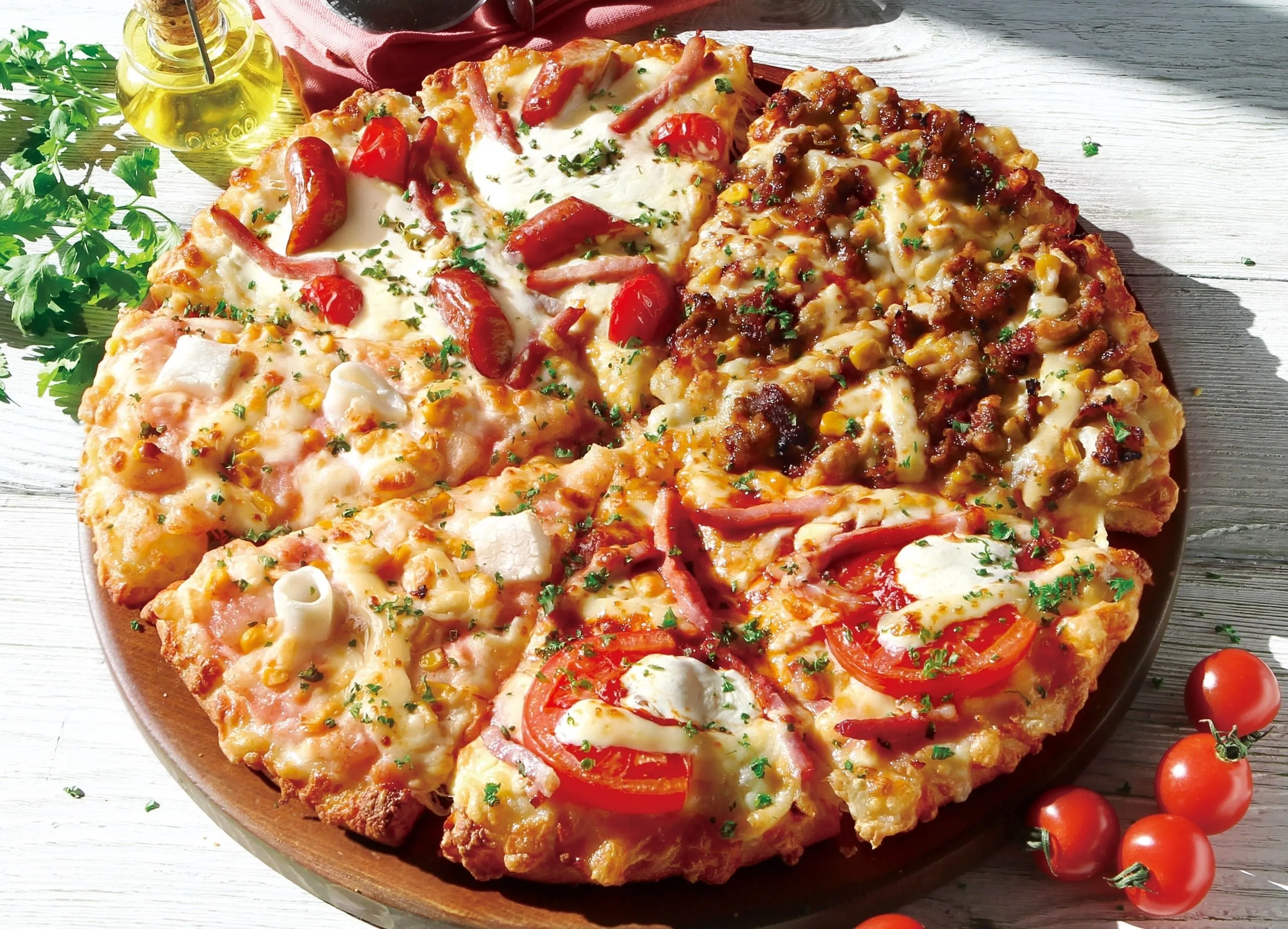 イチキュッパ!1,980円(税抜)のお求めやすい価格はそのままに、新商品「特製ミートソースとマスカルポーネのピザ」、「とろけるチーズと粗びきソーセージ」を加えて新たなおいしさに生まれ変わりました。個性的な味が1枚で楽しめる大人気クォーターピザです。