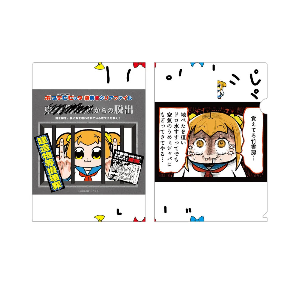本日2月22日(木)より発売する「ポプテピピック謎解きクリアファイル」は、竹書房へのたび重なる破壊活動によりついにポリスメンの世話になってしまったポプ子を、謎を解き明かすことで拘置所から救出するストーリー。自宅で遊べるので気軽に購入できる上に、ヒントも用意されているので初心者にもオススメの謎解きグッズとなっております。