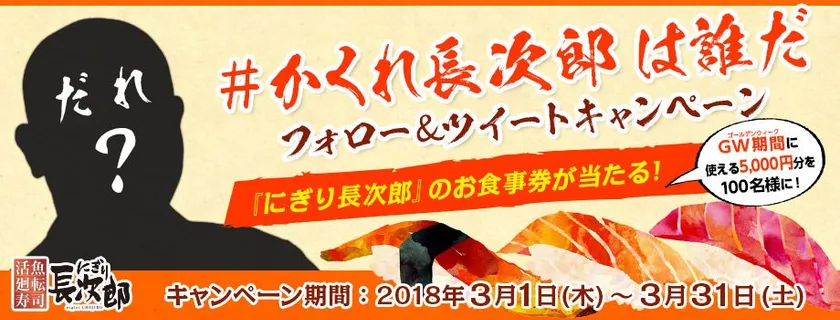 「#かくれ長次郎は誰だ フォロー&ツイートキャンペーン」では、にぎり長次郎公式Twitterアカウント( @nigirichojiro )をフォローいただいた方なら、どなたでも参加することが可能!3月1日(木)より公開のWEB限定動画を見て、動画内に登場する有名人を探してください。「#かくれ長次郎は誰だ」と「有名人の名前」を書いてツイートすれば応募完了。抽選で100名様にゴールデンウイーク期間中に使えるお食事券5,000円分をプレゼントします!