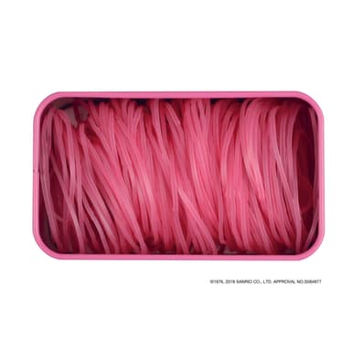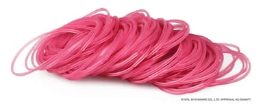 《オーバンド ハローキティ缶》の中には、透きとおったキレイなピンクの輪ゴムが入っています。シリコーン製の輪ゴムは熱さや寒さ、紫外線(UV)に強く、劣化しにくいのが特長です。また天然ゴム不使用のため、ゴムアレルギーの心配も少なく、気になる輪ゴム特有の臭いもありません。