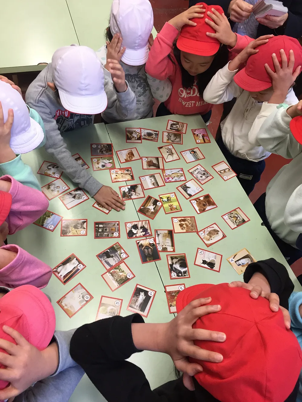 また、授業の合間にはアイペットオリジナルの「ワン!にゃん!かるた」も授業で使用しています。アイペットの社員も参加して、グループ毎にかるたを全力で楽しんでいる様子でした。かるたを見た子どもたちからは、「可愛い!」「欲しい!」と大好評でした。