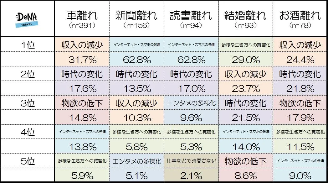 「〇〇離れ」の上位5つでそれぞれが思う「〇〇離れ」が進む理由を集計したところ、「車離れ」、「お酒離れ」は「収入の減少」(それぞれ31.7%、24.4%)、「新聞離れ」「読書離れ」は「インターネット・スマホの発達」(どちらも62.8%)、「結婚離れ」は「多様な生き方の寛容化」(29.0%)が最も多い回答となりました。