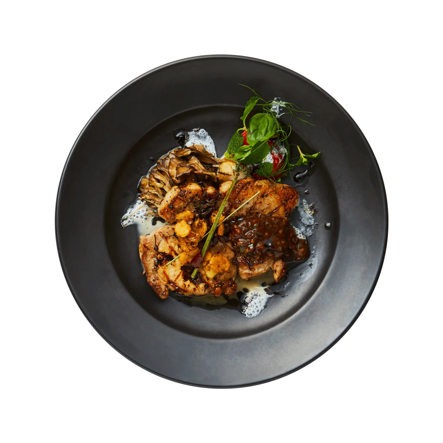 150gの大判ロース肉をソテーし、オーブンで火入れします。やさしい味の豚にアクセントのエピス、香りの強い地がらしのソースで仕上げました。