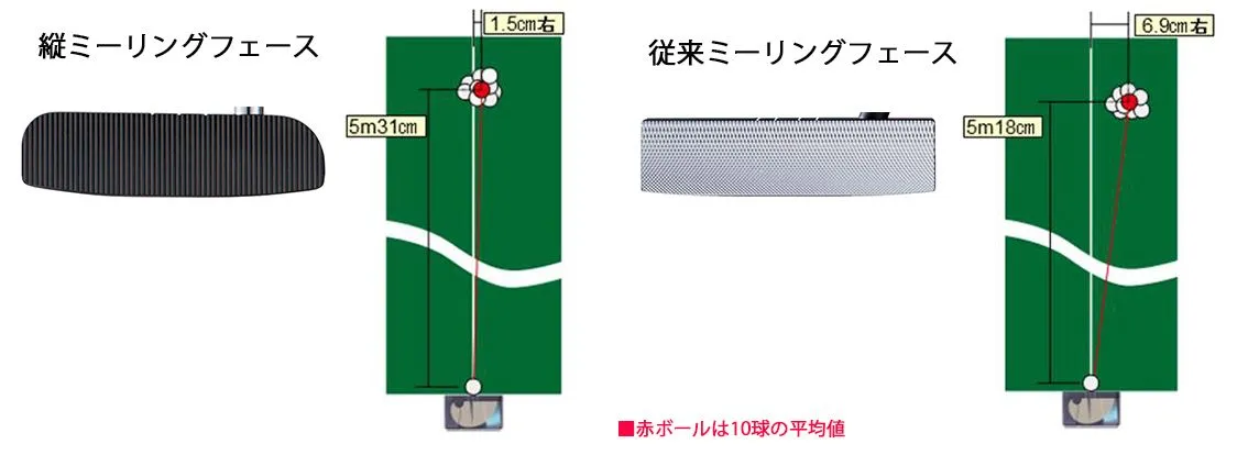 フェース表面のミーリングを縦にしたことにより、従来のフェースミーリングより転がりが優れ、直進性も向上。5mの距離をパッティングマシンでテストした結果、従来品と比べ、ブレ幅は約5分の1に、ボールの転がりは約3%向上しました。