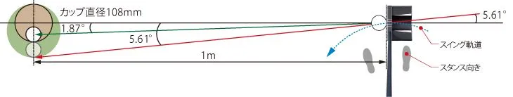 カップまで1mの距離をスクエアにインパクトする事を前提にした場合、上図のように0°(スクエア)~5.61°(カップ左淵にボール1個分を加えた赤ライン上)の範囲内でストロークすれば、理論上ボールは緑ライン内を転がりカップインします。