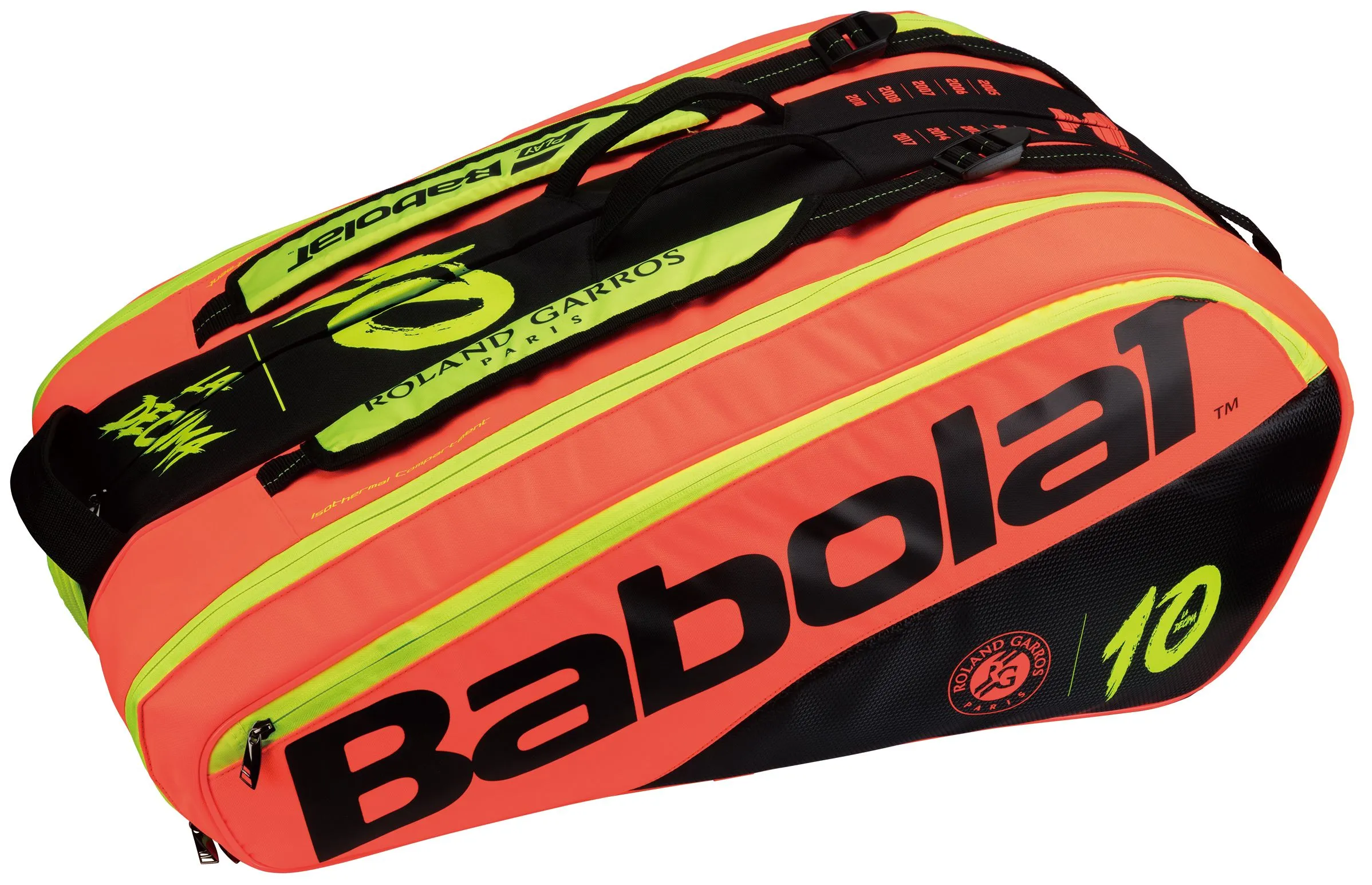 今回、昨年「全仏オープン」で10勝目を挙げたラファエル・ナダル選手(スペイン)を讃える記念モデルとしてラケット「ピュア アエロ デシマ フレンチオープン」、ラケットバッグ「ラケットホルダー×12 デシマ ピュア フレンチオープン」を発売します。現在発売しているラケット「ピュア アエロ」※3に、大会のキーカラーである“レッドクレー”を採用し、インパクトのあるデザインに仕上げました。「デシマ(DECIMA)」とは、スペイン語で「10回」という意味をもち、その名を付けました。ナダル選手は2月末から開催される大会でこれらの商品を使用する予定です※4。メーカー希望小売価格は、ラケットが38,000円+税、バッグが15,500円+税です。