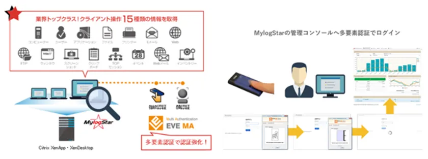 EVE MAは、仮想デスクトップでの生体認証(指紋認証、顔認証)を含む多要素認証を提供、MylogStarは仮想化環境においても物理環境と同様にファイル操作をはじめとする全15種類の操作ログの取得を可能としています。更に、MylogStarの管理コンソールの認証を多要素認証に置き換えることで、簡単でセキュリティ強度の高い運用が可能となります。