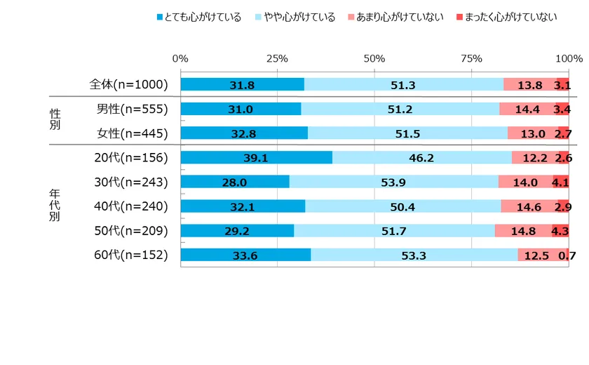 ・性別でみると、心がけていることとして、男性は「好きなこと(趣味など)に没頭する」(58.3%)が6割近くに達し、女性(49.9%)より8.4ポイント高、「スポーツ・散歩・野外活動など体を動かす」(27.9%)が女性(14.4%)より13.5ポイント高となりました。女性では、「何もせずゆっくり過ごす」(43.7%)が男性(34.2%)より9.5ポイント高、「美味しいものを食べる」(42.4%)が男性(27.6%)より14.8ポイント高となりました。男性のアクティブ志向に対し、女性は体を休めることをより心がけている傾向がみられます。