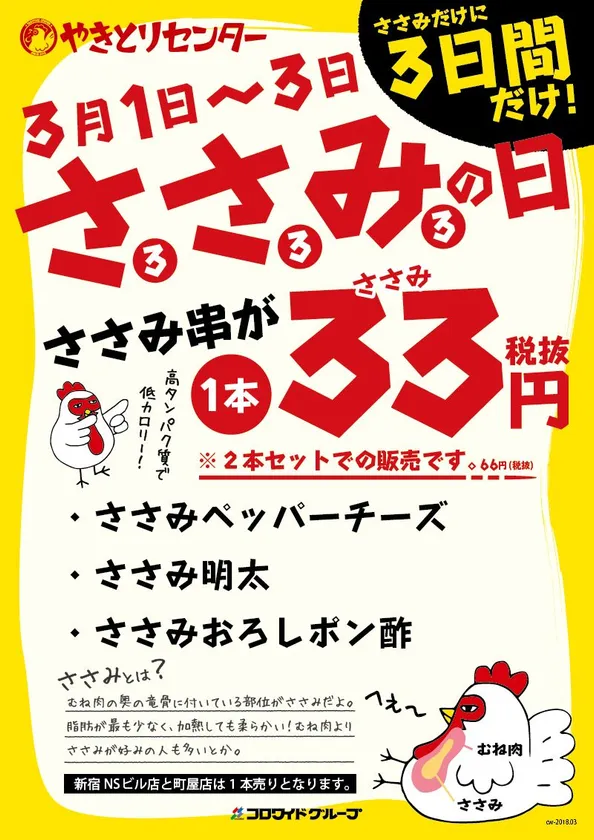 3月3日はささみの日!やきとりセンターでは、低脂肪で高たんぱくな「ささみ」の魅力を多くの人に知ってもらうため、「ささみペッパーチーズ」「ささみ明太」「ささみおろしポン酢」(各280円(税抜)/2本セット)の3商品を、3だけに、3日間限定でなんと1本33円 さんじゅうさんえん(税抜)で販売致します。