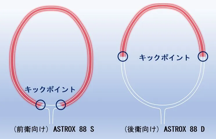 ASTROX 88 Sではシャトルをしっかりと掴み球持ちを向上させ、狙った所に飛ばせるようにフレーム全体をしならせた設計としました。ASTROX 88 Dでは上部を主にしならせて、打球時にシャトルを抑え込み鋭く沈み込む打球を生み出します。