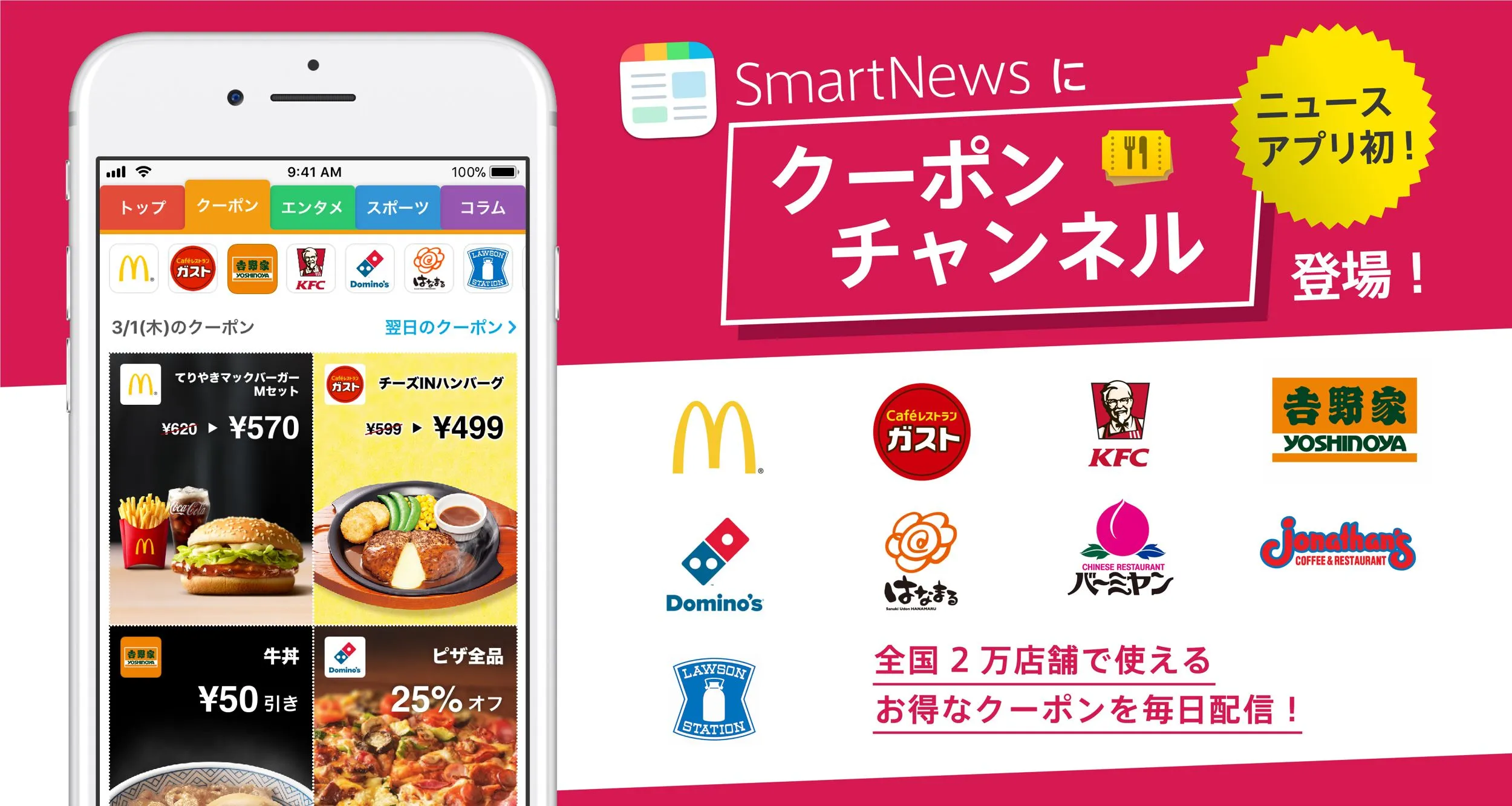 ニュースアプリ初!『スマートニュース』の新コンテンツに参画 外食やコンビ二エンスストアのお得が集う『クーポンチャンネル』に 主力ブランド「ガスト・ジョナサン・バーミヤン」 約2,000店が登場