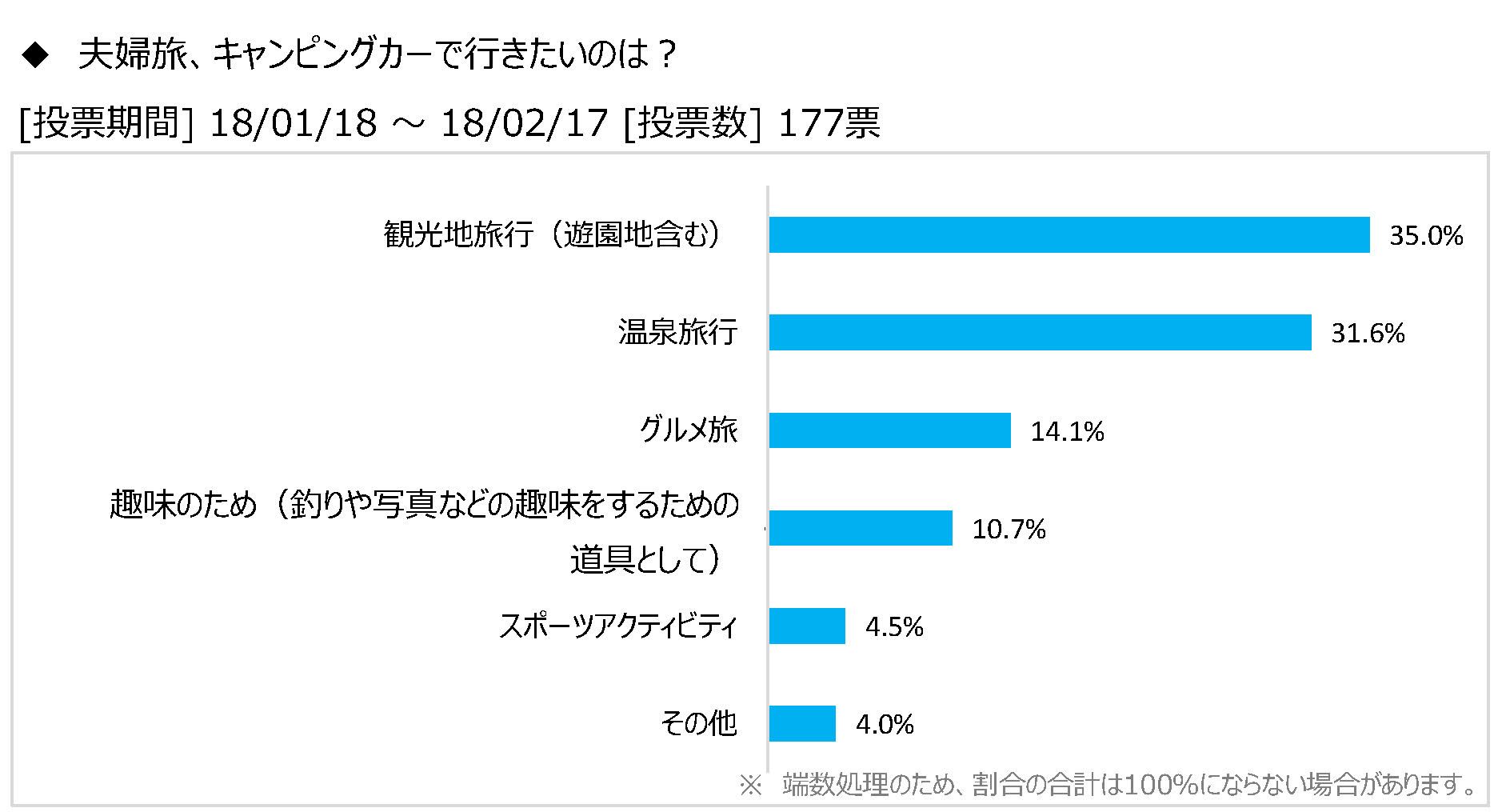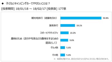 家族というテーマから、ひとりで旅行する方からもアンケートを集計しました。同じキャンピングカーであっても、使う家族構成でその目的が違ってくるようです。ひとり旅で使われている人は趣味を実践するための道具として、家族で使われる方は観光などを中心にした旅行を目的に、キャンピングカーを活用しているようです(図7、8、9、10)。また、子供がいるご家庭ではスポーツアクティビティ、ご夫婦ではグルメ旅が上位に入っているのも特徴的と言えるかもしれません。