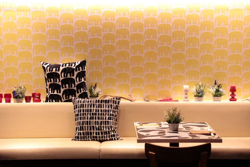 大人気のゾウ柄「エレファンティ」の黄色い壁紙が明るい空間を生み出しています