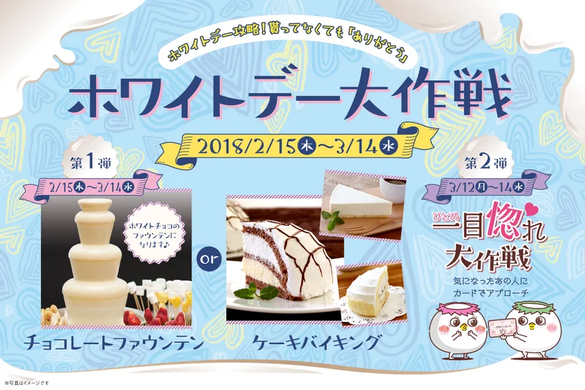 第1弾として2018年2月15日~3月14日の期間、“特別ケーキバイキング&ホワイトチョコファウンテン”が登場。さらに、第2弾として3月12日~14日の3日間限定で「一目惚れ大作戦」を開催します。