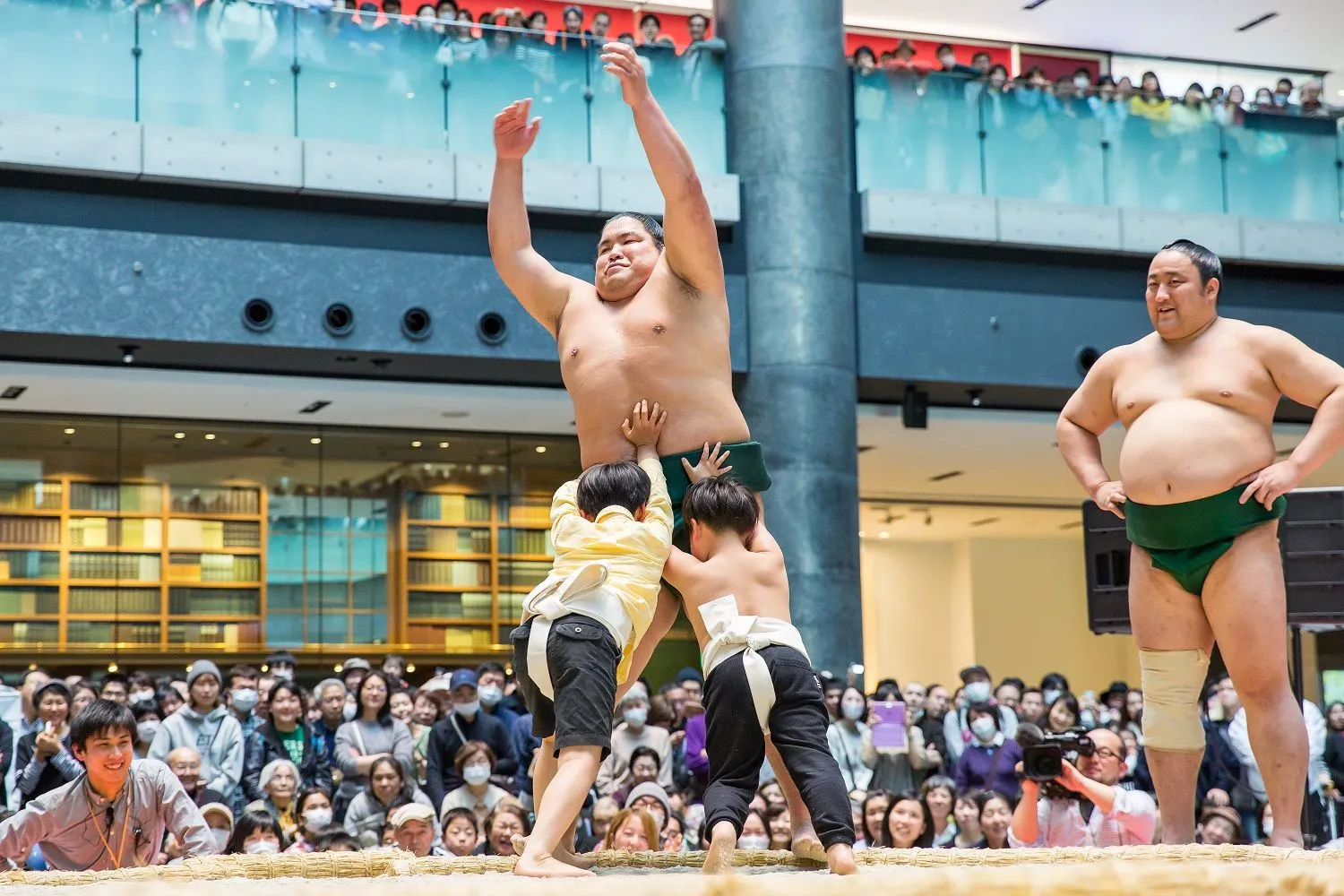 今年は会場が屋内の北館1Fナレッジプラザとなり天候に左右されることなく、約5,000人の相撲ファンにお越しいただき、人気力士の取組みを観覧いただきました。また、寄席太鼓や相撲甚句(すもうじんく)、髪結いや初切(しょっきり)などの相撲の伝統が披露されるとともに、子どもたちがちびっこ相撲に参加し歓声が上がりました。