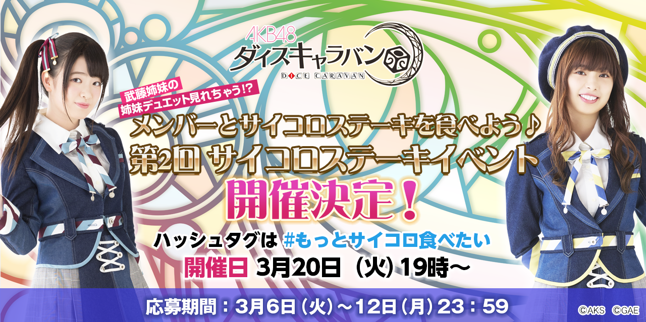 株式会社GAE(本社:東京都武蔵野市、代表取締役:大友貴司、以下 GAE)は、2018年 春リリース予定のAKB48を起用したゲームアプリ『AKB48ダイスキャラバン』(略称:ダイスキ)のPR動画、『ほにゃらら~サイコロトーク』第10弾をAKB48公式YouTubeチャンネルにて公開し、AKB48のメンバーとサイコロステーキが食べられる特別イベント「第2回サイコロステーキイベント」の開催決定と参加応募の受付開始を発表いたしました。