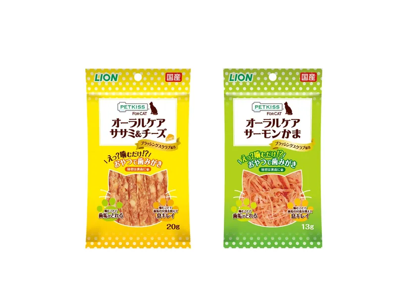 ライオン商事株式会社(代表取締役社長・川島 元樹)は、歯みがき効果を持たせた猫向けのオーラルケアトリーツ『PETKISS FOR CAT オーラルケア』シリーズに、「ササミ&チーズ」と「サーモンかま」の2品を追加し、2018年2月28日(水)から全国にて新発売いたしました。