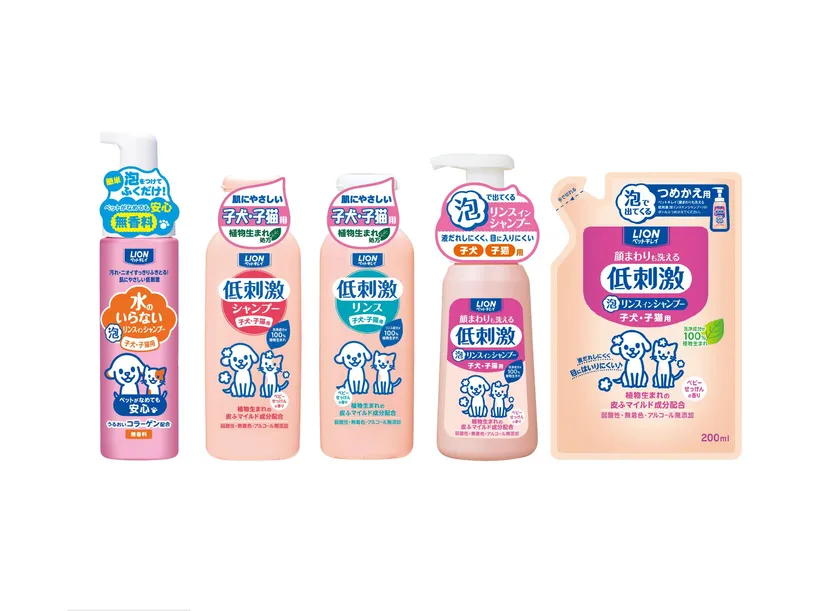 そこでこの度、『ペットキレイ』シリーズより、自宅シャンプー習慣化促進につながる子犬・子猫期から使えるシャンプーシリーズとして、お散歩デビュー前に、すすぎ不要でふき取るだけ、水なしでシャンプーできる『ペットキレイ 水のいらないリンスインシャンプー 子犬・子猫用』を新発売。また、お散歩デビュー後に自宅でのシャンプーデビューをお手伝いする『ペットキレイ 低刺激シャンプー 子犬・子猫用』、『ペットキレイ 低刺激リンス 子犬・子猫用』、『ペットキレイ 顔まわりも洗える泡リンスインシャンプー 子犬・子猫用』を、改良新発売いたします。