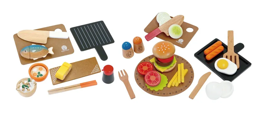 お子さまがごっこ遊びをしながら楽しく「食」に興味を持つきっかけ作りになるよう構成された、「和食」と「洋食」2つのこだわりが詰まったおままごとセットです。