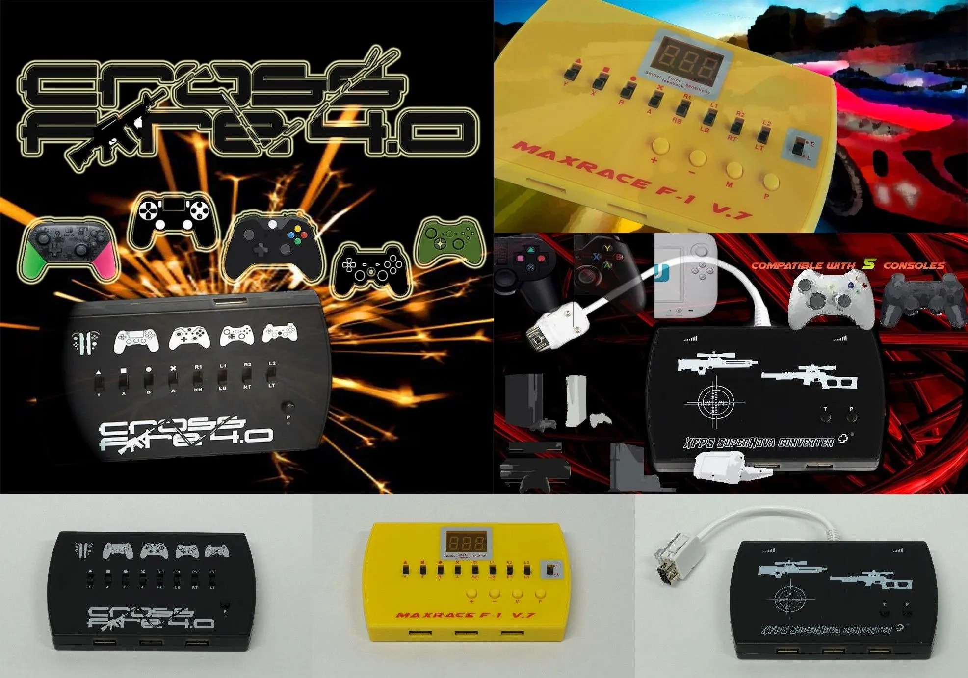 「クロコン」シリーズ3種 「XCM Cross fire 4.0」「XCM MaxRace F-1 v.7」「XCM XFPS Supernova+」は家庭用ゲームでいろいろな機種のコントローラーが使えるゲームパッド用コンバーターです。