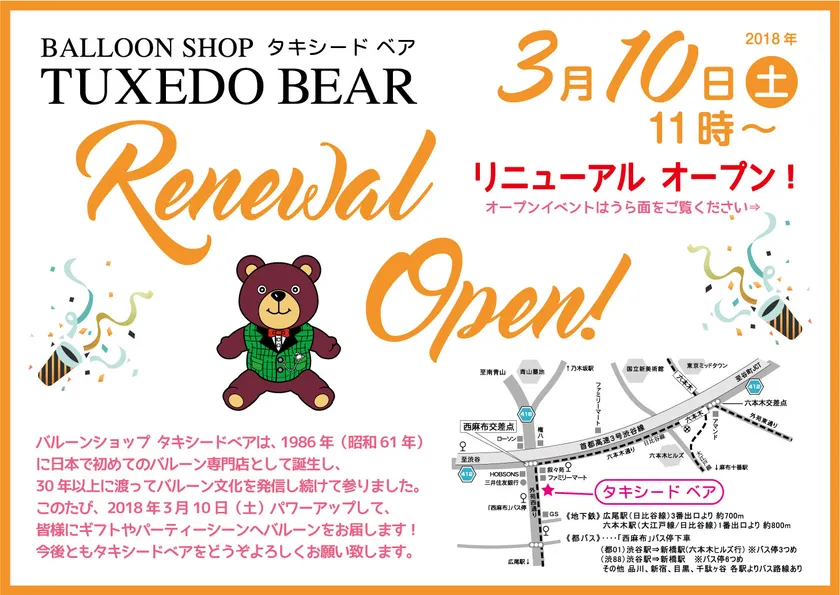 日本で初めてのバルーン専門店として1986年にオープンしてから30年以上にわたって、バルーン文化を発信してきた「バルーンショップタキシードベア」(所在地:東京都港区)は、店舗を一新し2018年3月10日(土)にリニューアルオープンします。