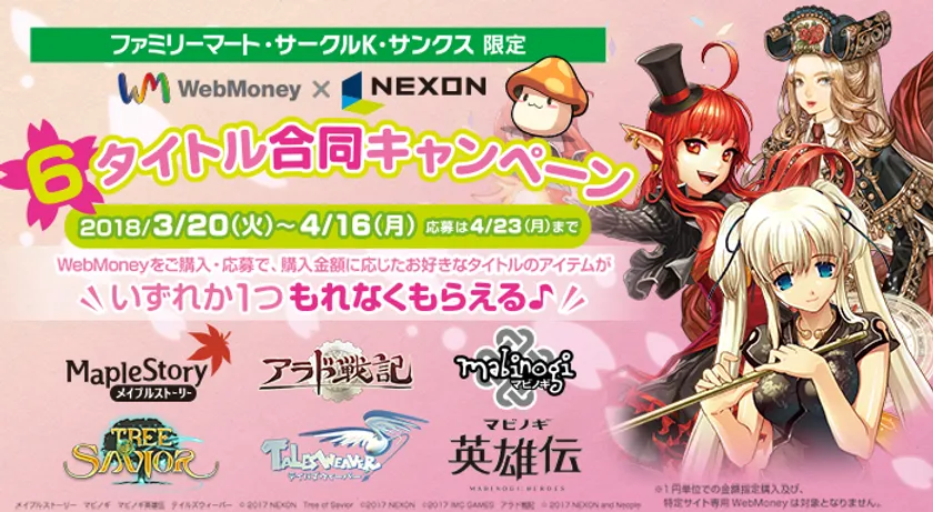 株式会社ウェブマネー(本社:東京都港区、代表取締役社長:森田 康裕)は、株式会社ネクソン(本社:東京都中央区、代表取締役社長:オーウェン・マホニー)、株式会社ファミリーマート(本社:東京都豊島区、代表取締役社長:澤田 貴司)と協力し、「ネクソン×WebMoney 6タイトル合同キャンペーン」を2018年3月20日(火)より実施します。